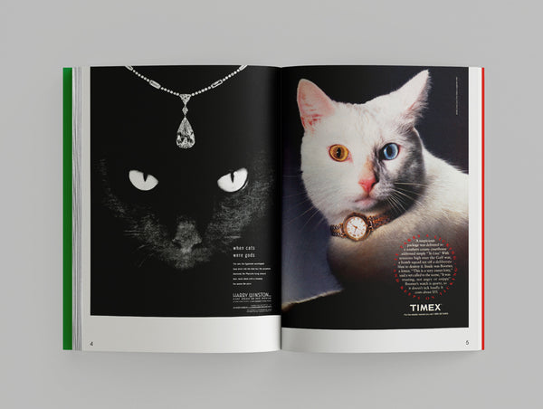 Cats in advertising are a popular and effective tool to capture consumers' attention. With their cuteness, elegance, charm, and playful lightness, they can be positive associations with a brand or product, reinforcing its message. Their versatility and instant recognition make them an unbeatable marketing asset. This image collection showcases cats in advertisements or product packaging for watches, jewelry, cosmetics, perfume, cars, cameras, alcohol, cigarettes, furniture, design, art, music, and more. Interestingly, cat food – the one product that makes the most sense for cat related advertising – has been totally excluded.