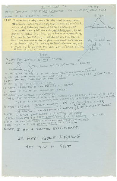 Notes from the Woodshed collects the artist's notes from his work in the studio alongside selected interviews and texts. Edited by Katy Siegel, one of Whitten's long-standing champions, this volume offers an intimate look at the artist in his element: the studio. Now in its second edition, this publication is the definitive resource on Whitten’s writings, presenting a fully transcribed collection of the artist’s handwritten logs. Selections from these writings are illustrated with facsimiles of the originals, giving us a feel for the studio and for Whitten’s hand, animating his remarkable line of thought. This edition also features a new afterword in the form of a conversation on Whitten between curators Matilde Guidelli-Guidi and Zoé Whitley and artist Glenn Ligon that sketches out the different forms a deep engagement with his writings might take.