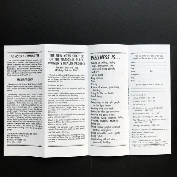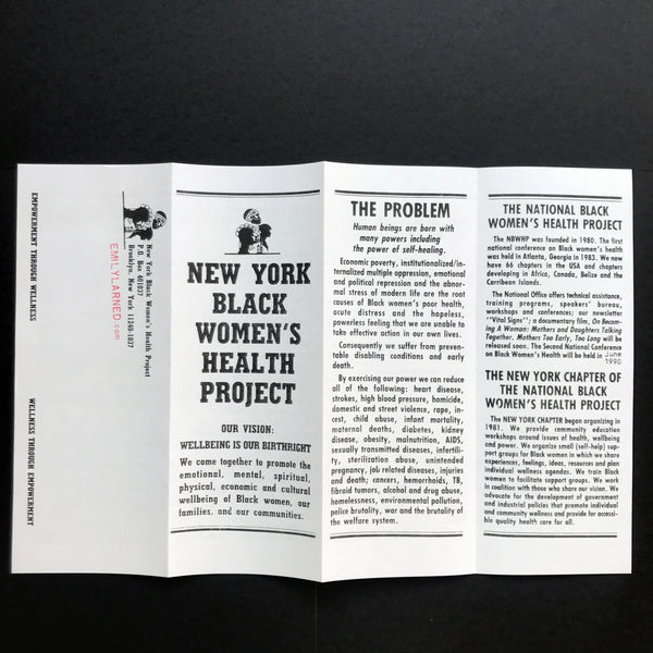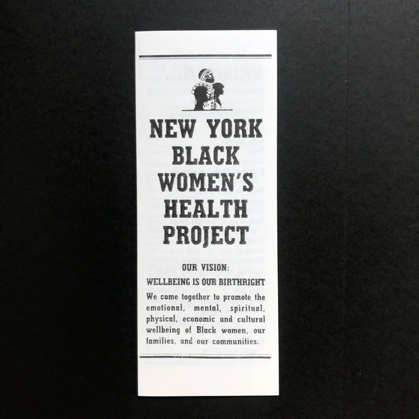 "Our Vision: Wellbeing Is Our Birthright. We come together to promote the emotional, mental, spiritual, physical, economic and cultural wellbeing of Black women, our families, and our communities." The Brooklyn-based New York Black Women's Health Project was founded by Gwendolyn Braxton as a chapter of the National Black Women's Health Project, now known as the Black Women's Health Imperative. In 1980 Byllye Avery founded the National Black Women's Health Project "as a way of filling the void in both the mainstream health care system and the feminist health movement regarding the specific needs of African-American women," Braxton explained in a 1991 article excerpted for the contextual leaflet included with this reissue.